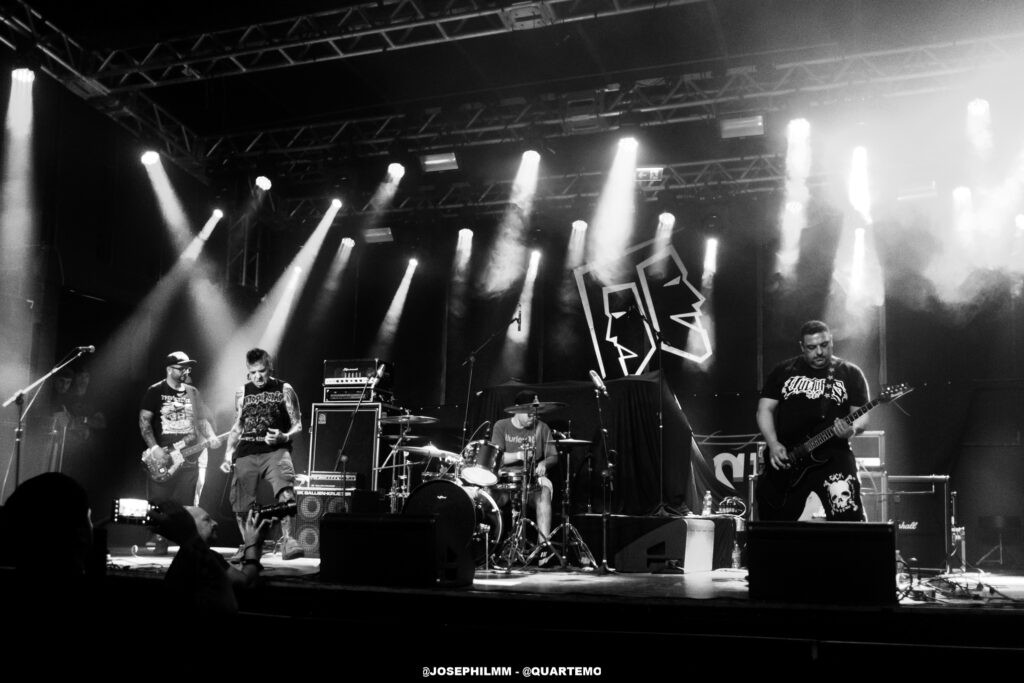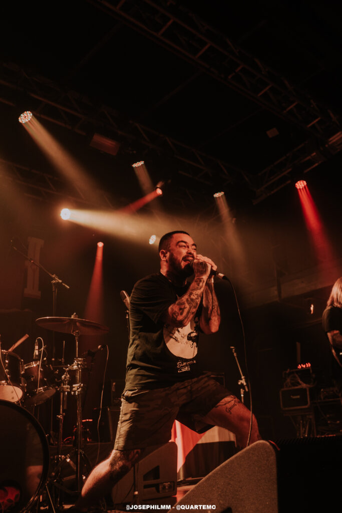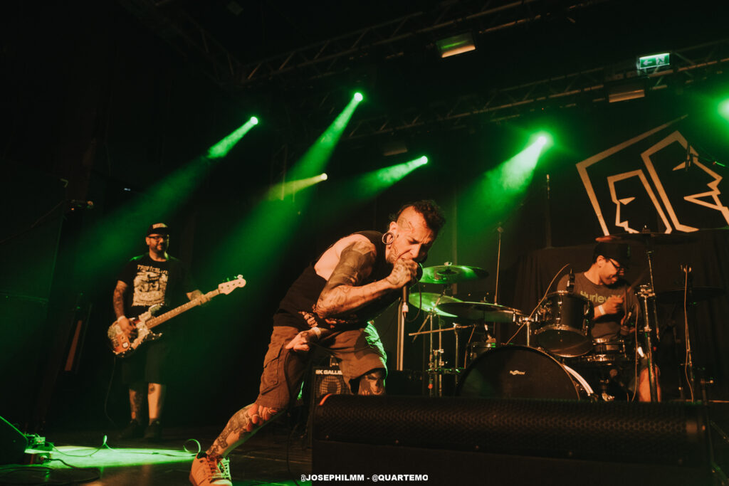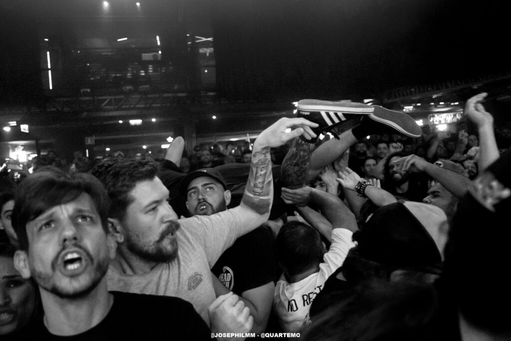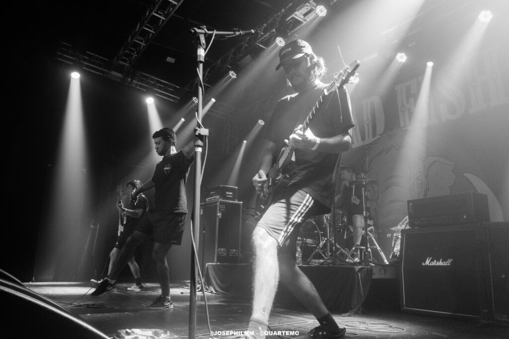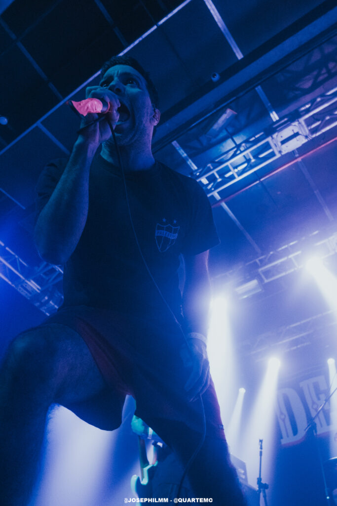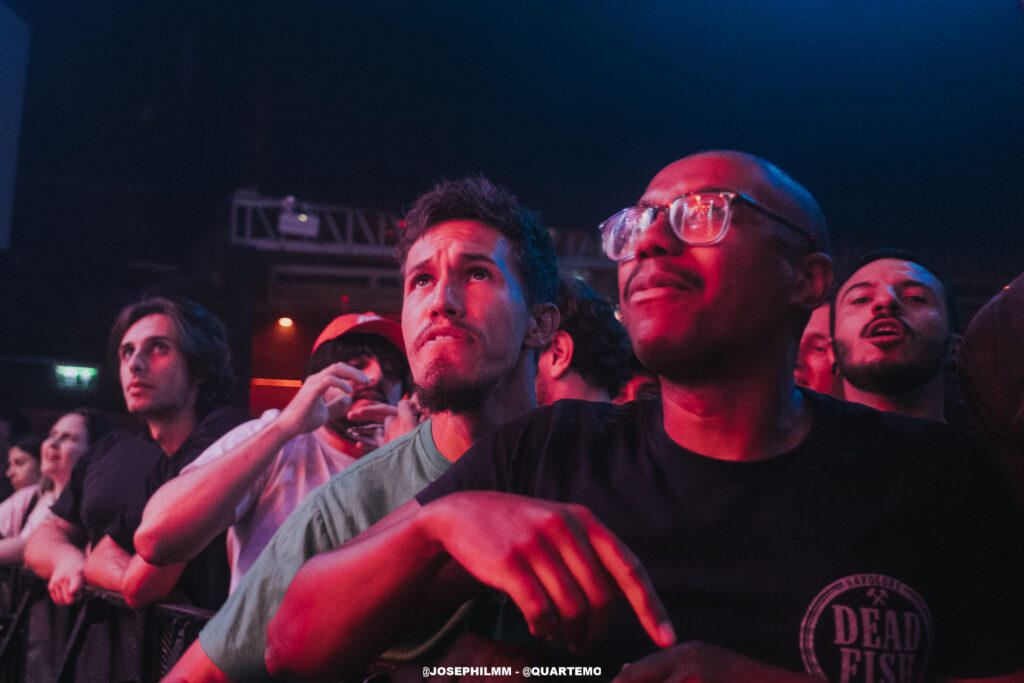 As duas bandas de abertura do evento, Tropical Mess e Vultures, ambas locais, não apenas aqueceram o público, mas também estabeleceram uma atmosfera poderosa e coesa que preparou o terreno para a intensidade do Dead Fish. A Tropical Mess mergulhou de cabeça em um som hardcore poderoso que animou o público, inicialmente tímido. A presença marcante de adereços como a bandeira da Palestina e símbolos antifascistas no palco não apenas reforçou a mensagem da banda, mas também estabeleceu uma conexão imediata com a audiência, trazendo à tona a essência revolucionária do hardcore. Por sua vez, a Vultures entregou um hardcore mais agressivo e denso, com arranjos pesados, vocal gutural e uma performance fervorosa. O quarteto solidificou o palco para o Dead Fish, que subiu no palco por volta das 21h e encontrou um Opinião lotado.