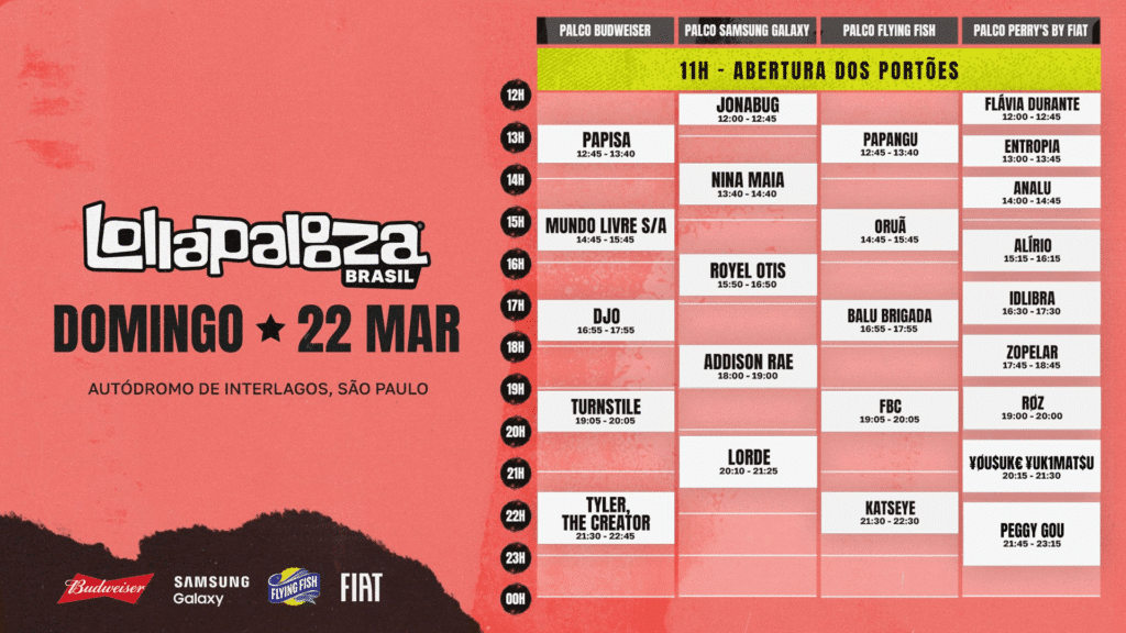 O Lollapalooza Brasil 2026 divulgou a divisão oficial de palcos e os horários das apresentações da nova edição. Os shows acontecem nos dias 20, 21 e 22 de março, no Autódromo de Interlagos, em São Paulo, com início ao meio-dia e abertura dos portões às 11h.